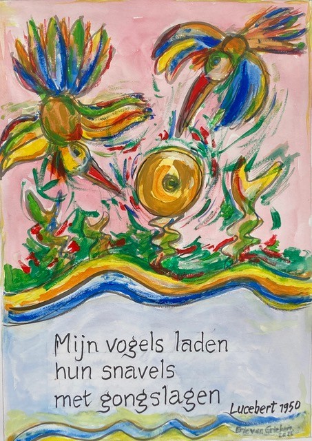 Tot half april exposeert Eric van Grieken, onze vormgever van de Hak-al, in de Acht Zaligheden. De werken van Eric zijn geïnspireerd op gedichten waarin veelal dieren een rol spelen: een hop, ijsvogels, fantasievogels, maar ook kakkerlakken. Het zijn schilderijen op papier, met aquarel, Chinese inkt en acryl.